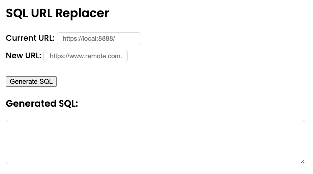 The user interface is straightforward, consisting of input fields for the local and remote URLs and a button to generate the SQL commands. Here’s the HTML setup: